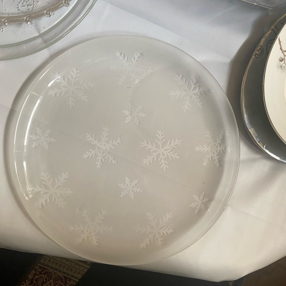 Elegant glass plate with a delicate snowflake pattern, perfect for any dining setting.