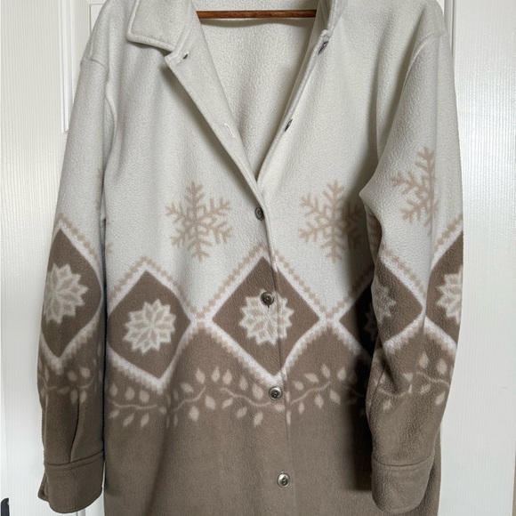 Cozy fleece button-up jacket with snowflake pattern. Features shades of cream and brown.