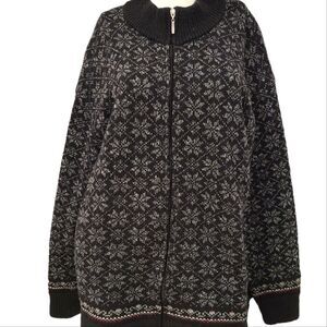 black and gray snowflake print zippered sweater size XL. Used but in good condition. Tag is missing, see measurement, also, feels like wool.