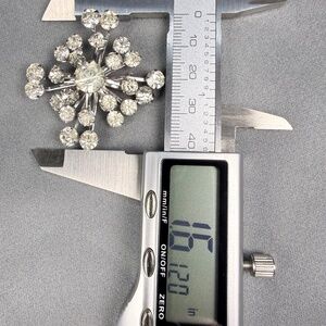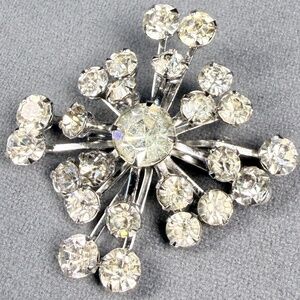 A Silver tone Snowflake Rhinestone brooch that will make a black outfit pop.