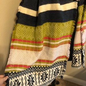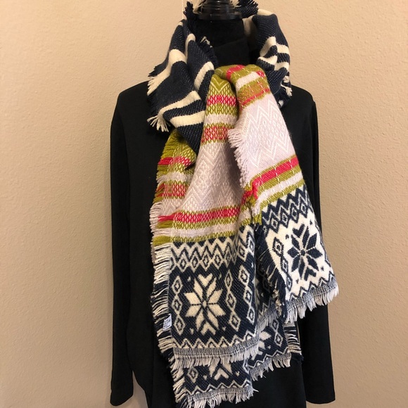 Navy, Cream, Fuschia, Green, and Lavender Scarf. Unsure of Brand but it is 100% Acrylic and extremely soft. Like new as it was only worn once and shows no wear.