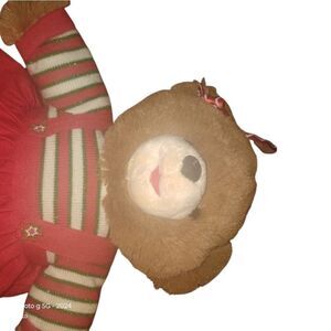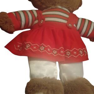 This delightful teddy bear features soft brown fur and a vibrant red dress, perfect for snuggles and playtime. A lovely gift for any child.