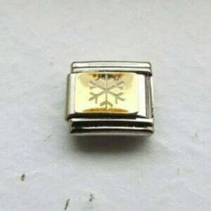 New never used 9mm stainless steel Italian charm bracelet link with a snowflake on a shiny gold enamel background on it. Fits all standard 9mm Italian charm bracelets, thanks for looking!