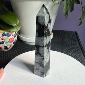 The snowflake obsidian crystal tower is a striking combination of black obsidian with white snowflake-like inclusions. Its metaphysical properties are believed to aid in balancing body, mind, and spirit, promoting inner reflection, grounding, and protection. It is said to assist in releasing negative energy and patterns, fostering clarity, and stimulating growth.