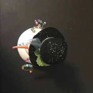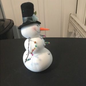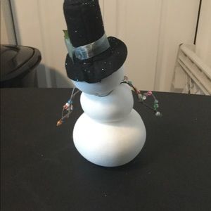 This adorable snowman stands approximately 8” tall. The sparkles helps magnifying the cuteness. Like new condition. Gently reposition the snowman to lean to a side or stand up straight. Made of cloth material.