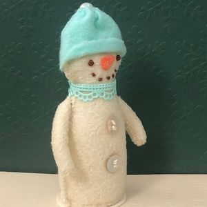 Cute hand-sewn stuffed snowman art doll.