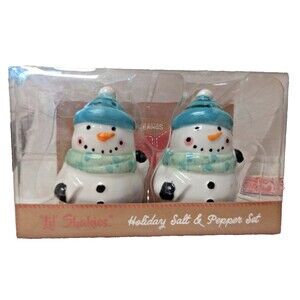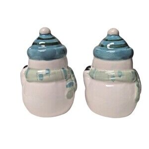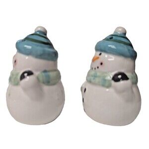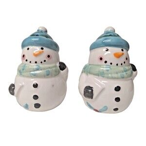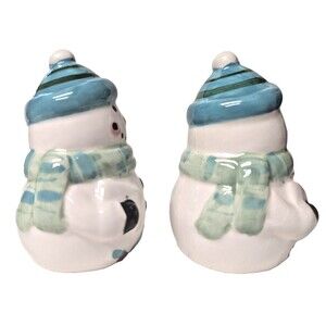 Made of stoneware, these 3.5 x 2.25-inch shakers feature a charming snowman design with a blue cap, adding a touch of whimsy to your table setting.