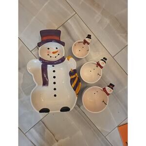 Adorable 4-piece ceramic snowman serving set, perfect for Christmas parties, holiday entertaining, snacks, candy, dips, and festive décor.
