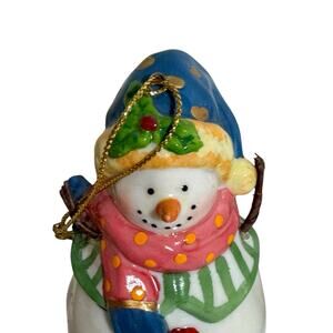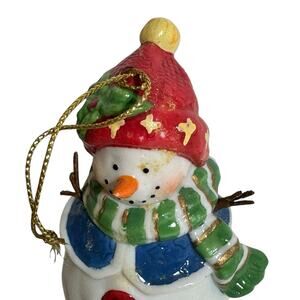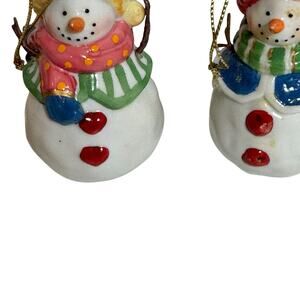 Snowman Christmas Tree Ornaments Holiday Bells Ceramic Hand Painted Set Of 2