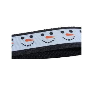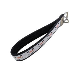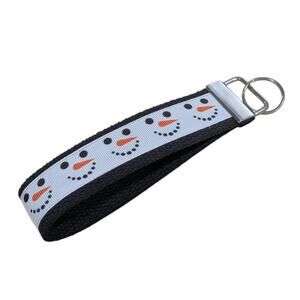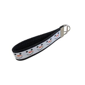This wristlet features repeating snowman faces. The black cotton webbing coordinates and makes the design pop. The hardware and keyring are silver in color.
