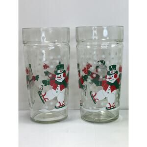 Snowman Glasses Set 2 Vintage Thick Walled Drinking Glasses w/Skating Snowman Images. I think they are Libbey but I don't see the "L" anywhere. They are quite thick and heavy. They measure approximately 6" high x 3" wide at mouth with a 15 ounce capacity.