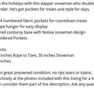 Snowman Hanging Fabric Advent Calendar 24 Numbered Pockets Christmas 38" Long