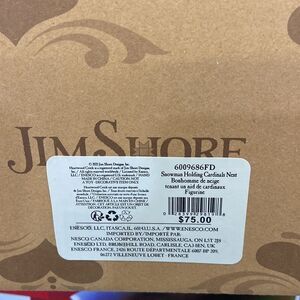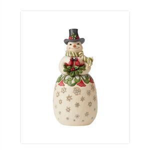 Holly in his hat, this snowflake patterned Jim Shore snowman holds joy in his heart and hands. Holding a twig of fresh holly, two cardinals kiss in the snowman's grip as he watches over them with a protective smile. He's a vision in red and green.