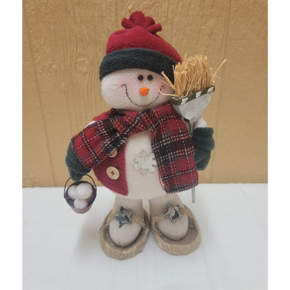 Snowman In Snowshoes Standing 14" Broom Pale of Snowballs Table Top Decor