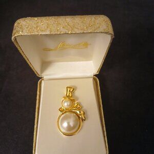 White & goldtone - 2 faux white pearls & goldtone border; Measures approx. 2"H x 1"W