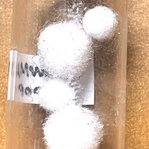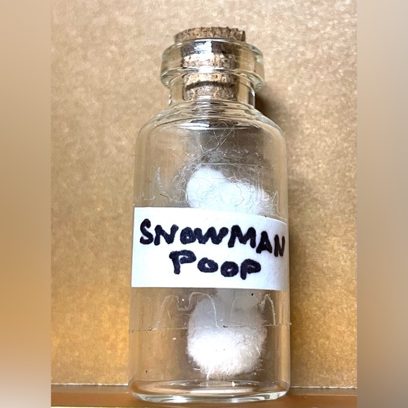Small glass bottle holding SnowMan poop from winter of 2023/2024