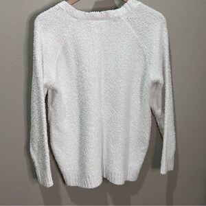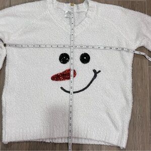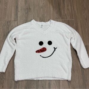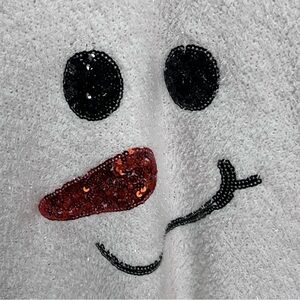 Cozy white V-neck sweater featuring a cute snowman face. Perfect for winter. Size small. Fashion by Mirabeau. Great condition.