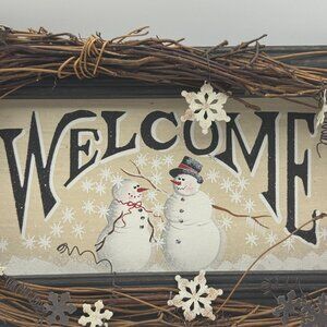 Snowman Welcome Wall Decor Wood Frame Twig Wreath Holiday Snowflake Accents Wint