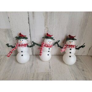 Product snowman on left missing top button, some discoloring on snowman on right bottom, mild glitter scuffing/ denting on styrofoam body's, mild scratches but otherwise in good condition, set of 3