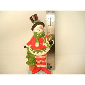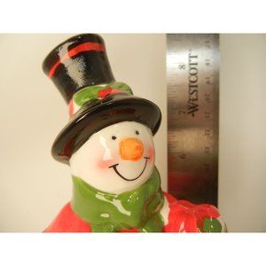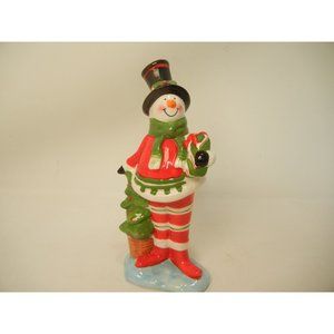 Vintage Snowman dandy, 9 in. standing ceramic hand painted glazed with top hat.Striped red and white stockings, red coat and green scarf. Nice mantel decor,