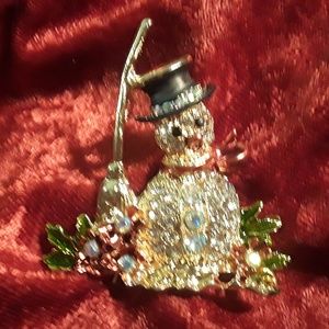 Adorable, new Holiday pin. Frosty stands 2" x 1 1/2". Great gift - even for yourself! This gold tone brooch shows Frosty covered with clear rhinestones, black hat, red bow around his neck and red rhinestone flowers with green leaves. Viewed from the side you can clearly see how 3 dimensional he is. He will bring a smile to anyone's face. Great gift idea....even for yourself!