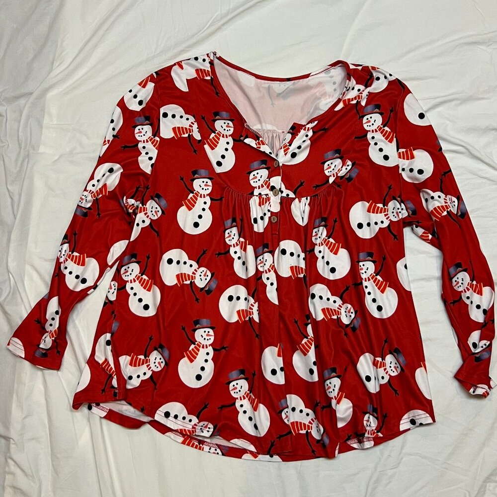 Show your Holiday Spirit with this red snowman shirt. Long sleeve, soft material. Only worn 3 times. I removed the tags for comfort, see measurements in the pictures. No smoking home.