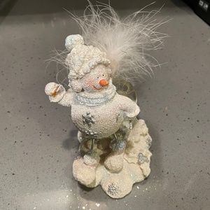 Adorable snowman with snow globe decoration. This resin and wire snowman is coated with glitter and has feather wings. He is pulling a sled with a snowman snow globe/water globe. There is a slight clouding of the liquid in the snow globe -- other than that this is in like new condition since used only one season. I think it was originally purchased in the mid 2000's. It is approximately 6" tall and 5" wide.