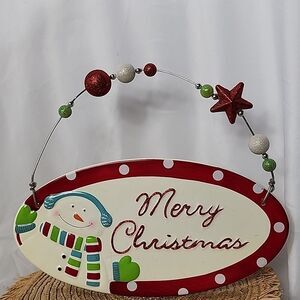 oval shaped ceramic sign with cheery snowman with metal hanger that has glittered beads