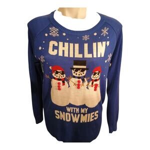 Snowmen Chillin With My Snowmies Well Worn Holiday Sweater Blue Women's Size L