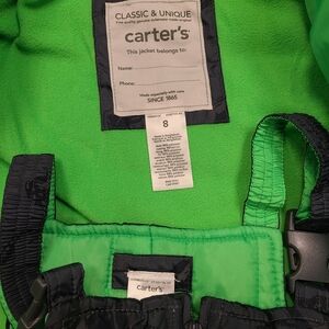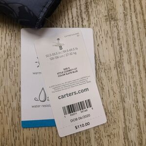 Carters 2 piece snowsuit set for boys. Features jacket with full zip. Hood is fleece lined. Jumper with zip at front and adjustable straps. Dinosaur 🦕 pattern. Brand new.