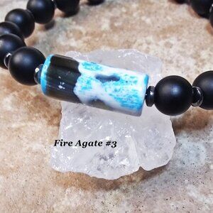 Each focal bead is different from the next one - these are gorgeous blue, white and black/gray Fire Agates - that make me think of wintry night skies. I added matte, black stone beads and small dark gray Hematite spacers to finish each bracelet. Strung on superior quality elastic stretch fiber and made to last, with proper care. This bracelet will fit the average sized wrist of about 7" or so.