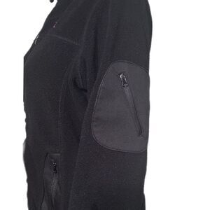 Good condition preloved Snozu fleece jacket in solid black! Perfect cold weather go to; zip closure pockets at hips and left sleeve, purple front embroidered Snozu logo, full zip closure. Quality material - This jacket holds up and washes exceptionally well! See below for measurements. Other than some piling (as pictured) & some small paint chips in the zipper there are no other obvious signs of wear!