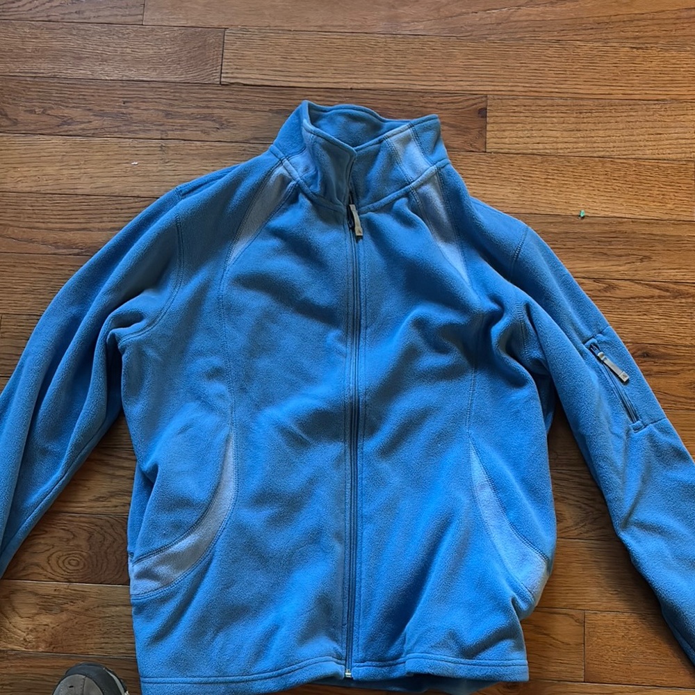 Soft teal fleece jacket by Snozu. Features a full-zip front.