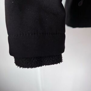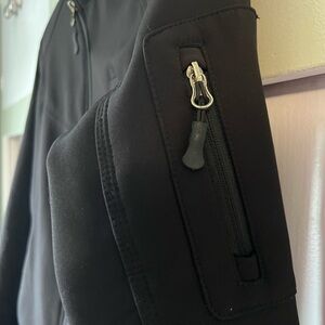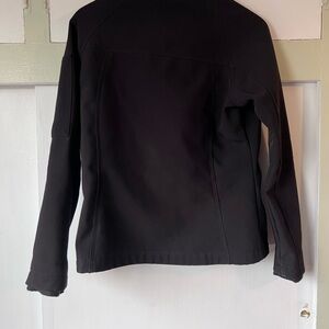 This small women’s fitted black jacket is pre-owned and in good shape with no visible imperfections. Snozu brand from their “The Platinum Collection”. Has a pocket on the left arm plus 2 hip pockets. Lightly lined with black fleece like material. Jacket ends at the hips. Face is 95% polyester and 4% spandex. Back is 100% polyester.