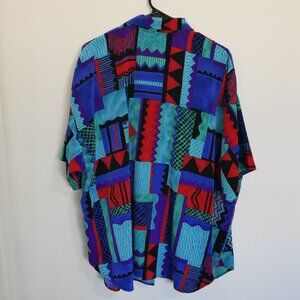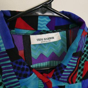 This Snug Harbor women's short sleeve button-up top is a vintage piece that features a beautiful geometric pattern in multicolor. It is made in the United States and is available in size 3XL (armpit to armpit = 28"), designed for plus size women. The top has a collared neckline and a button closure, perfect for a casual yet stylish look. The brand is known for its quality and this top is no exception. It is suitable for any occasion and can be paired with jeans or shorts for a comfortable yet fashionable outfit. This item is a must-have for any vintage clothing enthusiast and is sure to make a statement in any wardrobe.