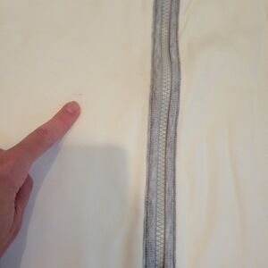 New with tags. gender neutral. small grey mark on front likely dust from closet? didn't want to wash since it's new with tags. size 6-12 months. zipper down front and shoulder snaps. light weight. 100% cotton.