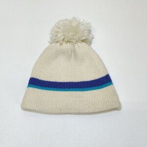 Snuggler Knit Beanie Hat PomPom Cream Stripe Wool Acrylic Blend Unisex 1990s VTG