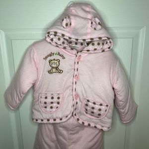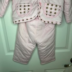 Toddler sweater and pants to stay warm . Puffy. 18months. Thick for ultimate warmth. Keep your baby warm. Teady bear print. Snugly baby. Bear ears on hoody. 65% cotton 35%polyester. Toddler puffy outfit for winter. Hooded toddler button up sweater. Pink pants. Snugly baby. Smoke free home. Bundle and save.