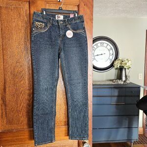 Description: NWT So brand girls’ size 14 jeans featuring cheetah-print detail and adjustable waistband—fun and practical.