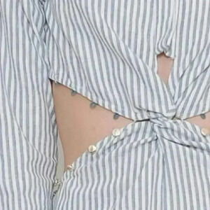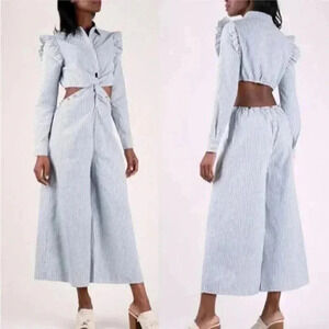 Striped Jumpsuit in a simply perfect style. With long sleeves and a classic lapel neckline this wide legged jumpsuit is perfect for any occasion. The Ruffle shoulders detail is fun and playful. A Knotted waist with side cutouts add the perfect touch of sassy.