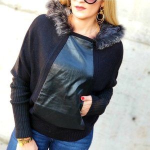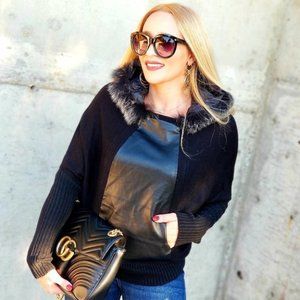 The sweater has so much going for it. A unique so soft vegan leather center trim with front pocket. The drawstring on the back. The hood is detachable and trimmed with fur.