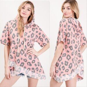 Short sleeve drop shoulder asymmetric layered animal print hooded tunic top