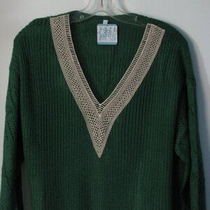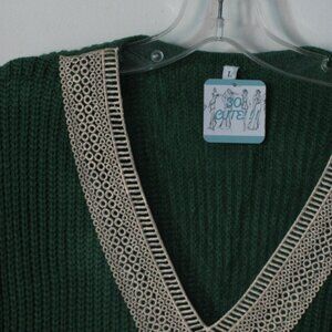 So Cute green sweater in size large. Heavyweight knit, long sleeves and a longer tunic style. V neckline with gorgeous embroidery in beige/tan. Slit at the side seam at hem on both sides. Fancy stitching open knit pattern on the sleeves. Made from 100% acrylic, machine wash.