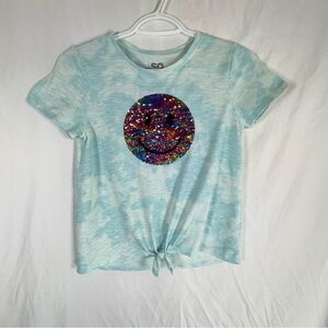 So Girls Light Blue Tie Dye Sequin Flippies Peace Smiley Face Knot Front Tee