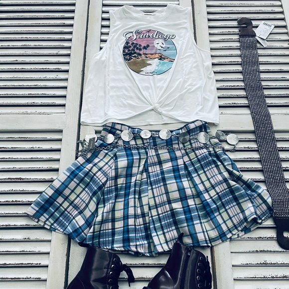 This is a super cute 60s skater cut skirt in a beautiful light green blue light pink and white plaid color-way. It is a mixture of polyester, Rayon an Spandex which gives it a flattering follow to the mini length. This has pleats all the way around the skirt. This is such a great piece to have in your wardrobe for dressing up or down depending on the occasion! The 60s mod vibes can be paired with almost anything to give a very versatile look. This skirt is in good vintage condition :) There is some wear on it which makes vintage awesome, nothing too noticeable but definitely wanted to note they are not in perfect shape!