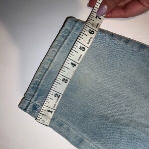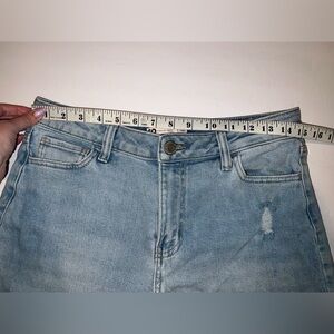 -Light wash high rise straight leg jeans. Distressed knees.
