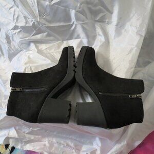 This pair of lovely ankle boots have never been worn, zippers on both sides, black, size 7.5, still in original box, man made material, excellent condition