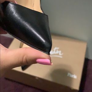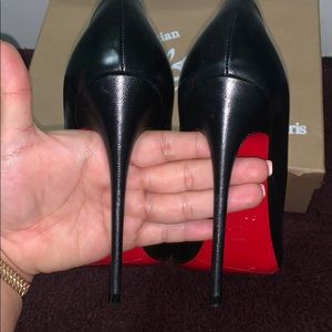 Black So Kate, size 36. Worn a few times with sole protectors in place. There may be just a few very tiny scratches on the red bottom. There is also a very small scuff on the left pointy part of the pump that is not visible unless you’re a few inches away. Box, dust bags, and heel tip bag with heel tips included. I also have a few more sole protectors I can include. 110% Authentic