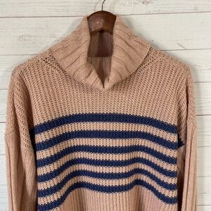 Item: Stay cozy and stylish with this striped tan and navy sweater. Perfect for any casual outing.