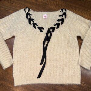 So Me Cream Sweater with Black Ribbon Detail | Women’s Medium | Soft Knit Lace-Up Pullover